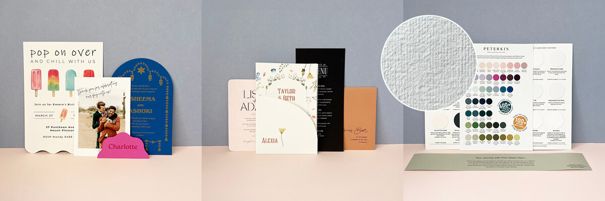 If you haven't already, then purchasing our Peterkin Texture Guide is a great place to start your project. Feel the texture of our most popular card and paper ranges to discover which ones you love and work best with your design. There’s also our colour palette guide to over 100 printable colours, and eight fab samples showcasing digital CMYK colour, white ink and digital gold printing. PLUS, each sample has handy design tips on the reverse 😊.
